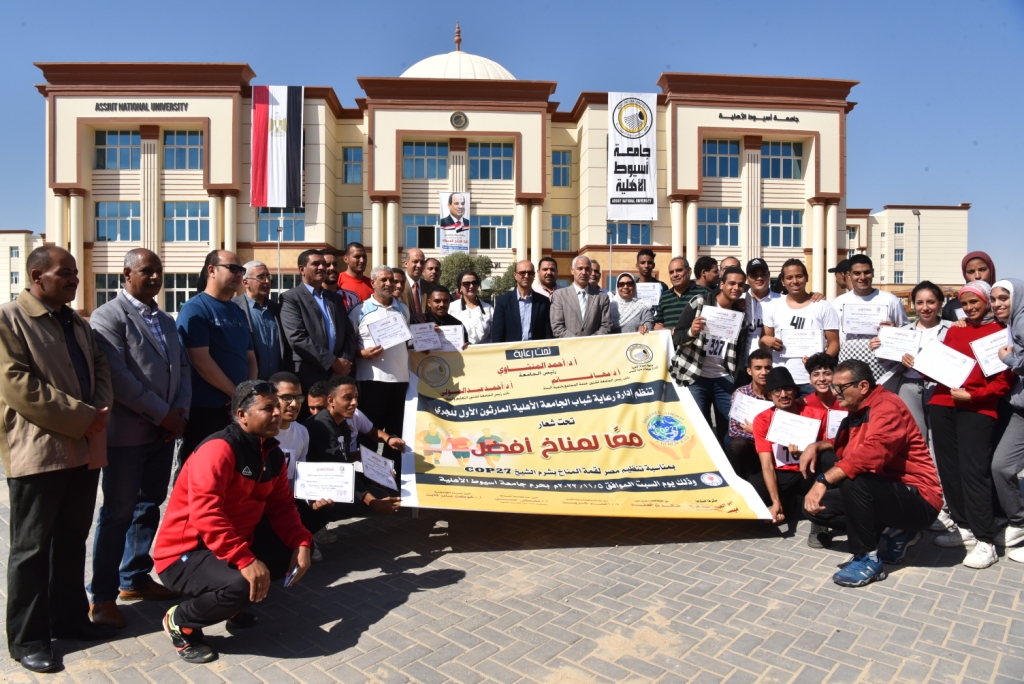 أطلق الدكتور أحمد المنشاوي القائم بعمل رئيس جامعة أسيوط إشارة البدء لانطلاق أول ماراثون طلابي حاشد " للجري"، و الذي يقام ولأول مرة في رحاب جامعة أسيوط الأهلية و الذي نظمته الإدارة العامة لرعاية الشباب، والذي يأتي بالتوازي مع احتفالية "جامعة أسيوط و مستقبلنا الأخضر " تزامناَ مع استعدادات الدولة المصرية لإطلاق قمة المناخ COP27 المقرر إنطلاق أعماله خلال هذا الأسبوع الجاري وحتى 18 نوفمبر الجاري بمدينة شرم الشيخ و بحضور حاشد من قادة و زعماء العالم من نحو 196 دولة من مختلف دول العالم، كما شارك في انطلاق فعاليات الماراثون الدكتورة مها غانم نائب رئيس جامعة أسيوط لشئون خدمة المجتمع وتنمية البيئة ، والدكتور أحمد عبدالمولى القائم بعمل نائب رئيس جامعة أسيوط لشئون التعليم والطلاب ، و الأستاذ شوكت صابر أمين عام جامعة أسيوط ، و الأستاذ مصطفى حسن أمين عام جامعة أسيوط المساعد والمشرف العام على الجامعة الأهلية ،و الدكتور أحمد شريت مدير عام الإدارة العامة لرعاية الشباب ، و لفيف من عمداء وأعضاء هيئة التدريس من مختلف كليات الجامعة الأهلية ،و قيادات العمل الأكاديمي إلى جانب المتخصصين بالعمل في الإدارة العامة لرعاية الشباب و المشرفين على تنظيم الماراثون و بمشاركة حاشد طلابي من مختلف كليات الجامعة الأهلية.