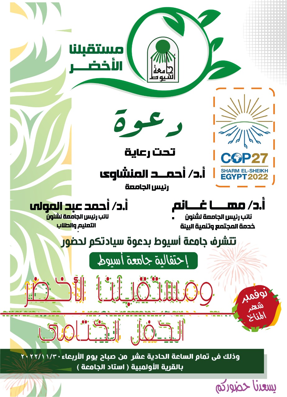أعلن الدكتور أحمد المنشاوي القائم بعمل رئيس جامعة أسيوط عن إختتام شهر المناخ والذي نظمته الجامعة طوال شهر نوفمبر الجاري بإقامة إحتفالية " جامعة أسيوط ومستقبلنا الأخضر " والمقرر لها يوم الأربعاء القادم 30 من نوفمبر الجاري بإستاد الجامعة بالقرية الأوليمبية والتي ينظمها قطاع خدمة المجتمع وتنمية البيئة بالتنسيق مع قطاع شئون التعليم والطلاب وبحضور عدد من القيادات المختلفة من خارج الجامعة والمتخصصين بالعمل من داخل الجامعة .