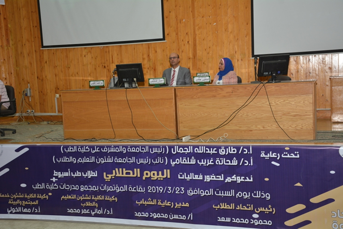جاء ذلك خلال مشاركة نائب رئيس جامعة أسيوط فى افتتاح فاعليات اليوم الطلابى لكلية الطب نيابةً عن الدكتور طارق الجمال رئيس الجامعة و بحضور الدكتورة أمانى عمر وكيلة الكلية لشئون التعليم والطلاب ، والدكتورة مها الخولى وكيلة الكلية لشئون خدمة المجتمع وتنمية البيئة ولفيف من رؤساء أقسام الكليات وأعضاء هيئة التدريس بها وحشد من طلاب الكلية بمختلف الفرق الدراسية وأعضاء اتحاد الطلاب بالكلية .