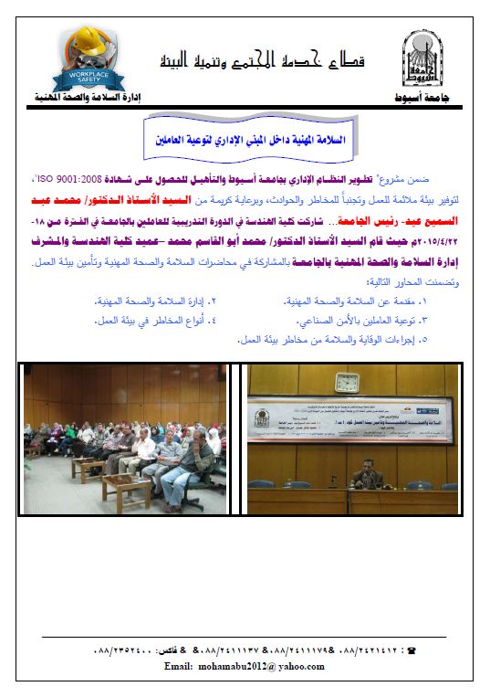 ضمن مشروع" تطـوير النظــام الإداري بجامعـة أسـيوط التأهيـل للحـصول علـى شـهادة ISO 9001:2008"،لتوفير بيئة ملائمة للعمـل وتجنبـا للمخـاطر والحـوادث وبرعايـة كريمـة مـن الـسيد الأسـتاذ الـدكتور/ محمـد عبـدالسميع عيد- رئيس الجامعة... شاركت كلية الهندسة في الدورة التدريبية للعاملين بالجامعـة في الفـترة مـن ١٨-٢٠١٥/٤/٢٢م حيث قام السيد الأستاذ الدكتور/ محمد أبو القاسم محمد –عميد كلية الهندسـة والمـشرف فى إدارة السلامة والصحة المهنية بالجامعـة بالمـشاركة فـي محاضـرات الـسلامة والـصحة المهنيـة وتـأمين بيئـة العمـل.