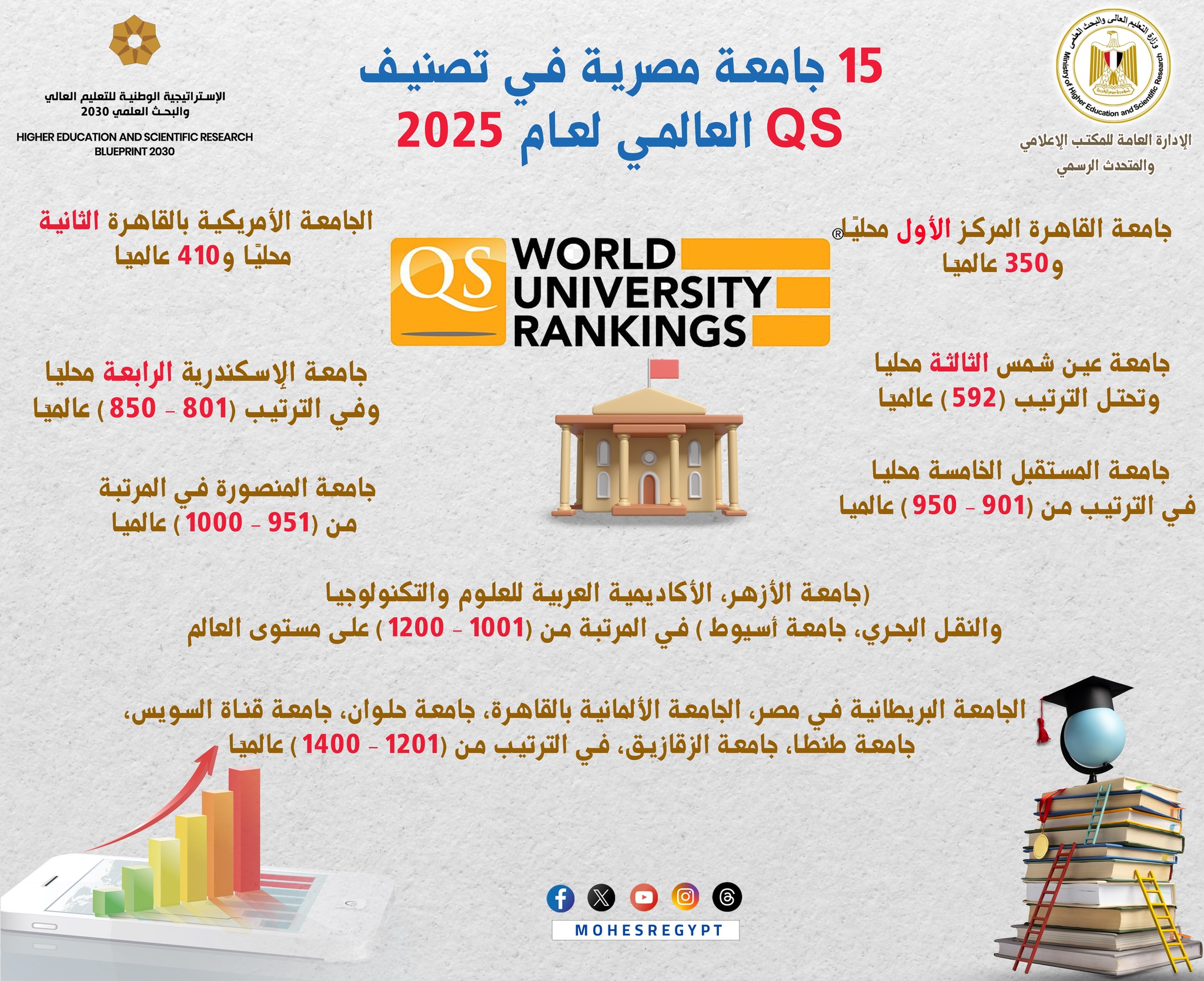أعلن الدكتور أيمن عاشور وزير التعليم العالي والبحث العلمي، إدراج 15 جامعة مصرية في تصنيف QS العالمي وفق أحدث إصداراته لعام 2025، والذي تضمن ترتيب 1500 جامعة من مختلف جامعات دول العالم.