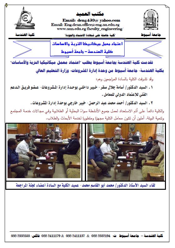 اعتماد معمل ميكانيكا التربة والأساسات كلية الهندسة - جامعة أسيوط 20 مايو 2015 اعتماد معمل ميكانيكا التربة والأساسات كلية الهندسة - جامعة أسيوط