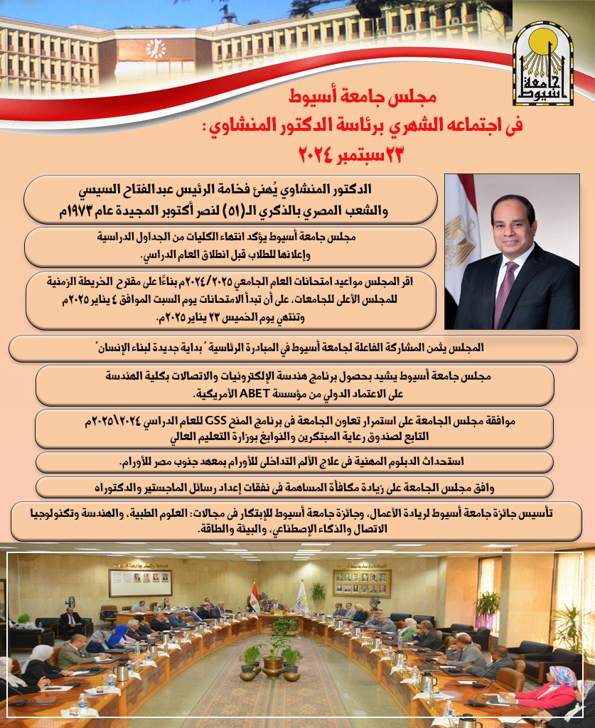 بالانفوجراف .. أبرز قرارات اجتماع مجلس جامعة أسيوط خلال انعقاده، يوم الإثنين ٢٣ سبتمبر ٢٠٢٤، برئاسة الدكتور أحمد المنشاوي رئيس جامعة أسيوط 23 سبتمبر 2024