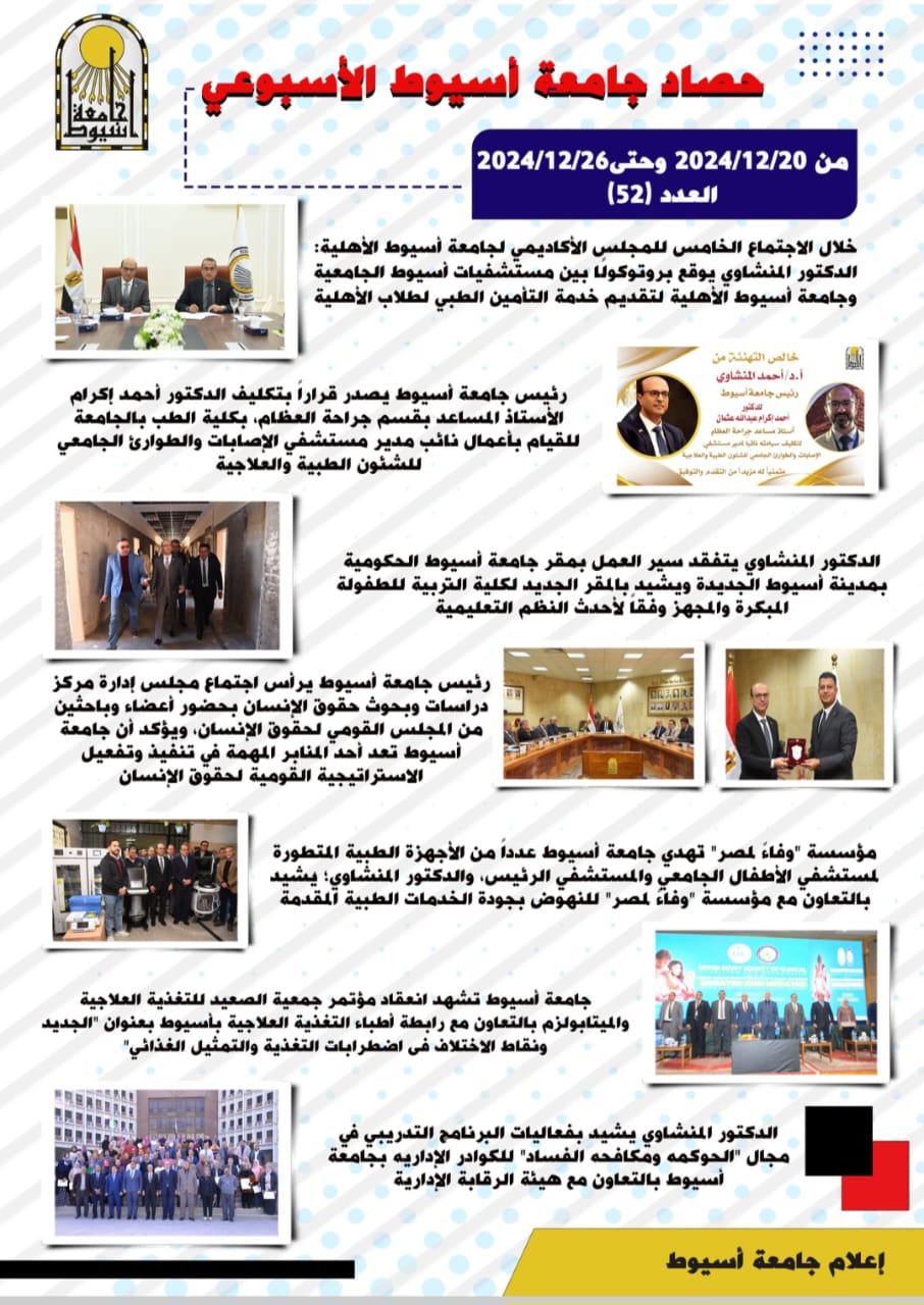 أصدرت جامعة أسيوط، بالانفوجراف حصادها الأسبوعي، لأهم الأنشطة والبرامج والفعاليات، خلال الأسبوع الماضي، في الفترة من 20 ديسمبر حتى 26 ديسمبر 2024، حيث افتتح الدكتور أحمد المنشاوي؛ تجديدات (5) ملاعب وصالة اللياقة البدنية وقاعة المناقشات وملعب جديد متعدد بكلية علوم الرياضة بتكلفة إجمالية تجاوزت (12) مليون جنيه، وأعلن رئيس جامعة أسيوط جاهزية وحدة الرعاية المتقدمة للجنين بمستشفى صحة المرأة الجامعي لاستقبال حالات التدخل الجراحي للأجنة، مشيدا بالدور العلمي والخدمي المتميز للوحدة في التأكد من صحة وسلامة الجنين والكشف عن العيوب الخلقية
