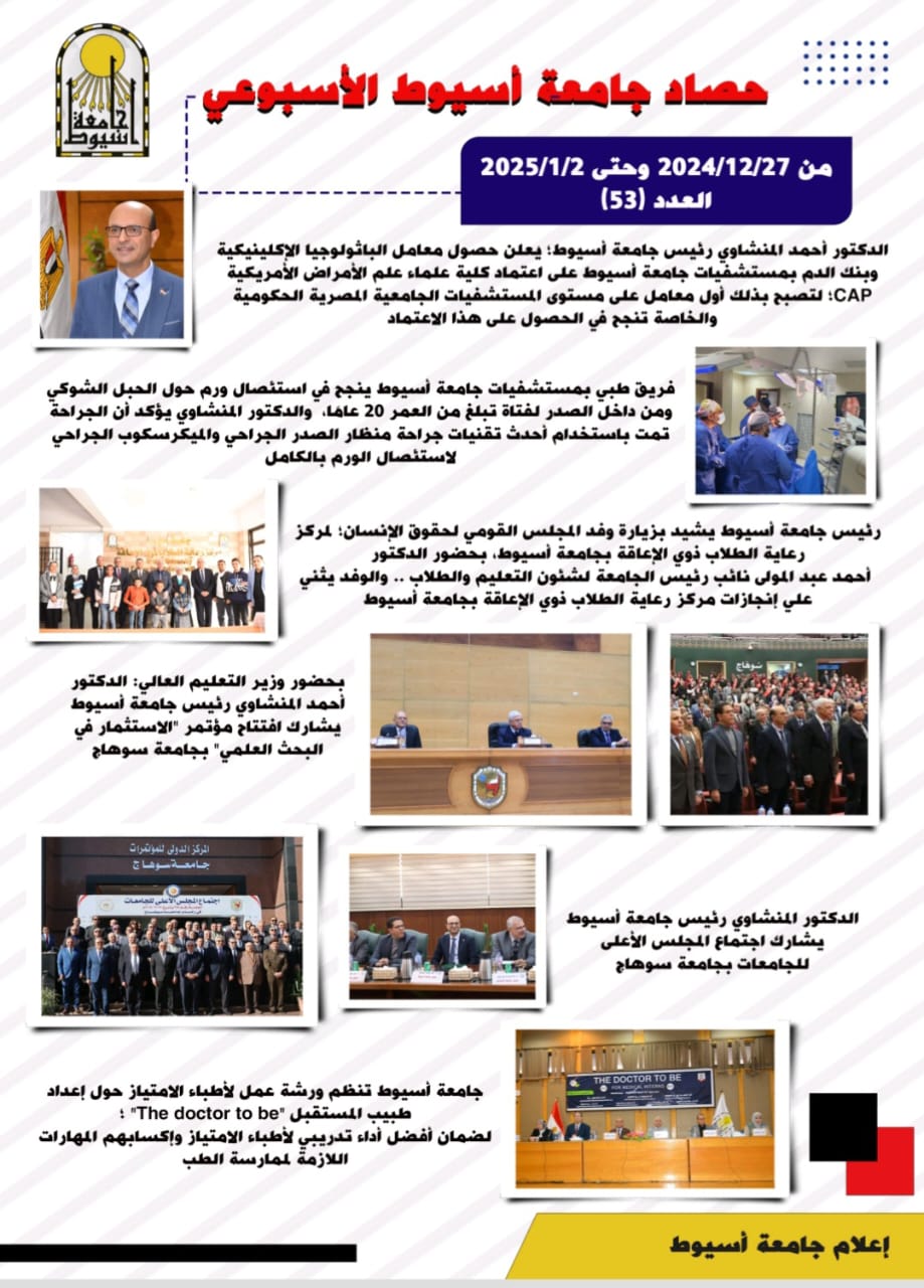• تقدم الدكتور أحمد المنشاوي رئيس جامعة أسيوط؛ بالتهنئة للشعب المصري بمناسبة العام الميلادي الجديد 2025، أعاده الله على مصر وشعبها بالخير والسلام والمحبة.