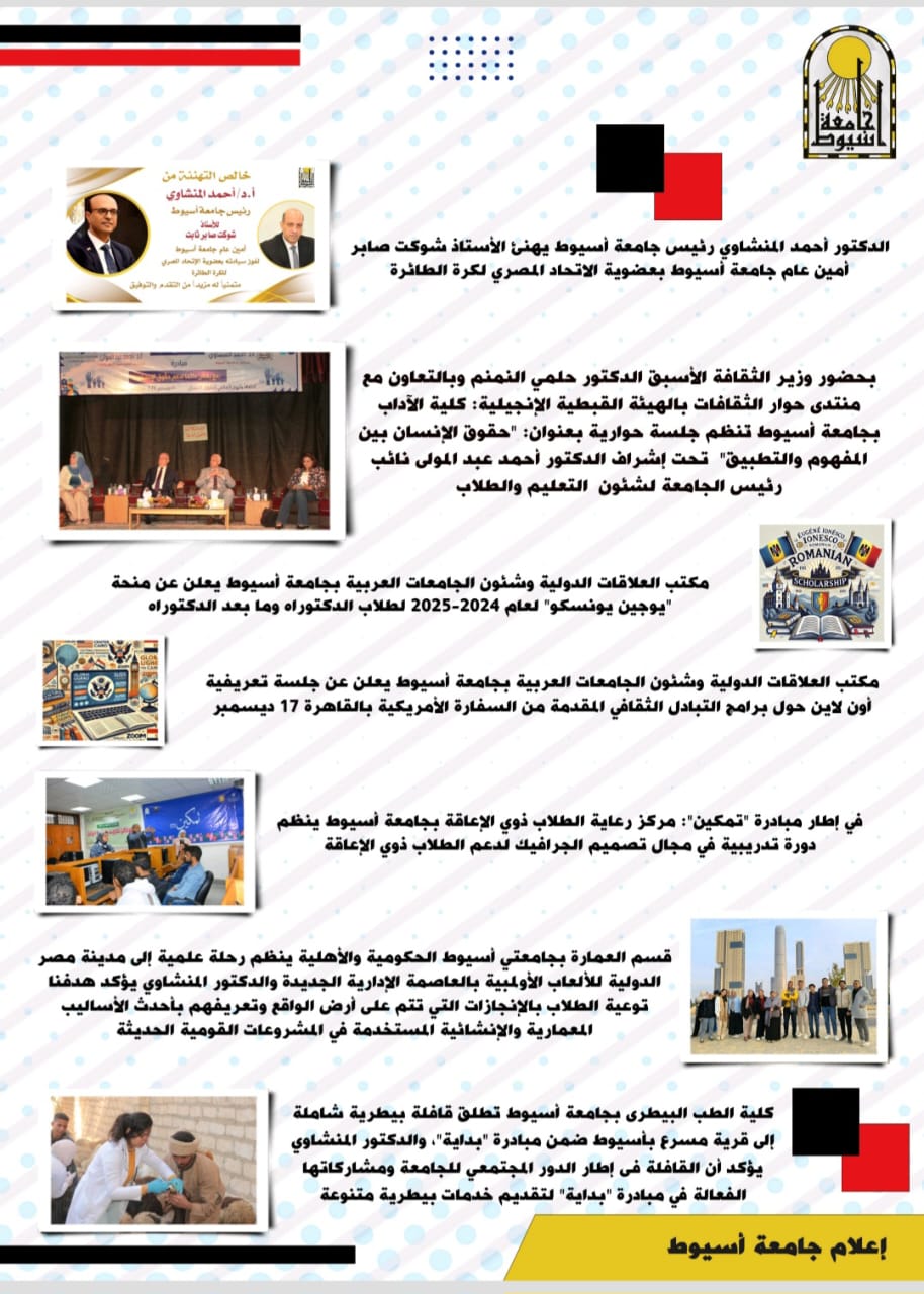 • في إطار المبادرة الرئاسية "بداية جديدة لبناء الإنسان": أطلقت جامعة أسيوط؛ عددًا من الأنشطة لإحياء التاريخ المصري والحضارة المصرية العظيمة لدى الأطفال بالتعاون مع مؤسسة "يارو" للحضارة المصرية ومؤسسة "مصر الخير"
