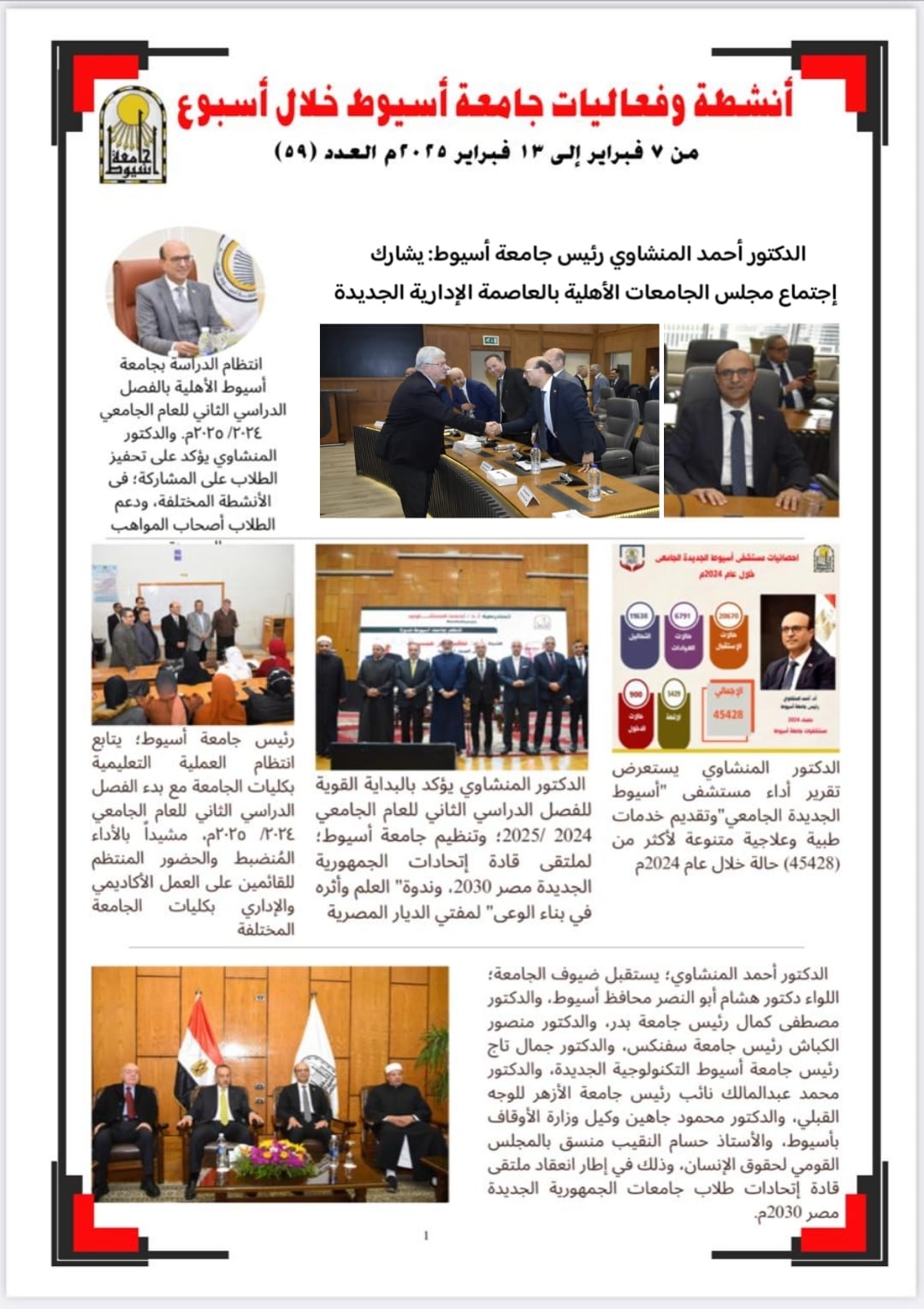 عقد مكتب التصنيف الأكاديمي الدولي بالجامعة اجتماعًا لمناقشة أنشطته وخدماته، كما نظم ملتقى قادة الاتحادات الطلابية محاضرة بعنوان "من المدرجات إلى المنصات: كيف يمكن للطلاب أن يقودوا التغيير". بالإضافة إلى ذلك، عقدت جلسة حوار مجتمعي حول "نظام الثانوية العامة الجديد (البكالوريا)" بالتعاون مع مديرية التربية والتعليم بمحافظة أسيوط.