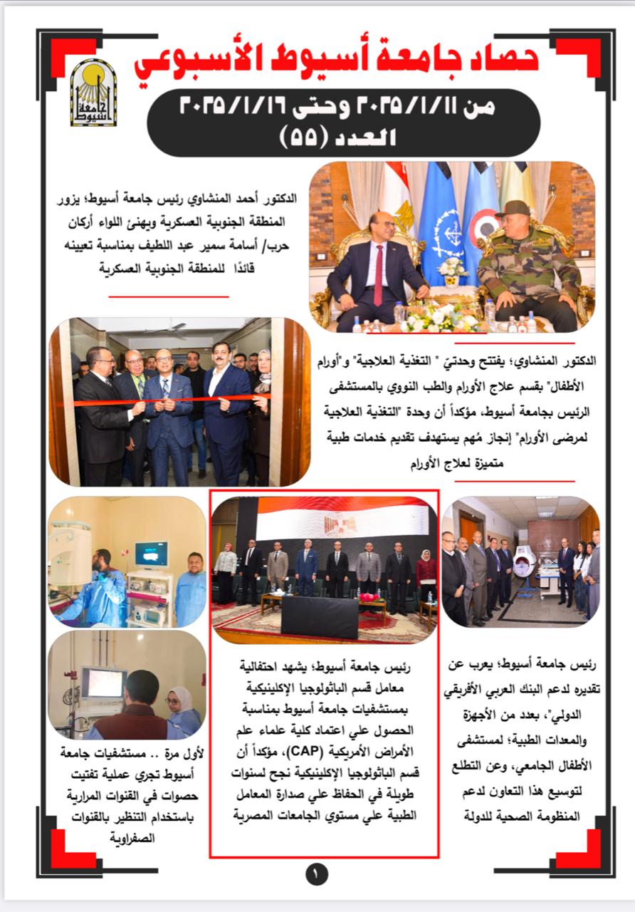 • شهد رئيس جامعة أسيوط؛ احتفالية معامل قسم الباثولوجيا الإكلينيكية بمستشفيات جامعة أسيوط بمناسبة الحصول علي اعتماد كلية علماء علم الأمراض الأمريكية (CAP)، مؤكداً أن قسم الباثولوجيا الإكلينيكية نجح لسنوات طويلة في الحفاظ علي صدارة المعامل الطبية علي مستوي الجامعات المصرية.