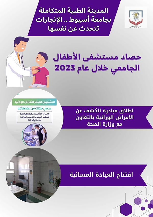جدير بالذكر، إن مستشفيات جامعة أسيوط شهدت خلال السنوات الأخيرة عمليات تطوير وتحديث شاملة على كافة المستويات وفق أحدث النُظم بهدف تقديم خدمة طبية متميزة على أعلى مستوى وبالمجان للمرضى، وتمثلت أهم انجازات مستشفى الأطفال الجامعي في الانفوجراف التالي: