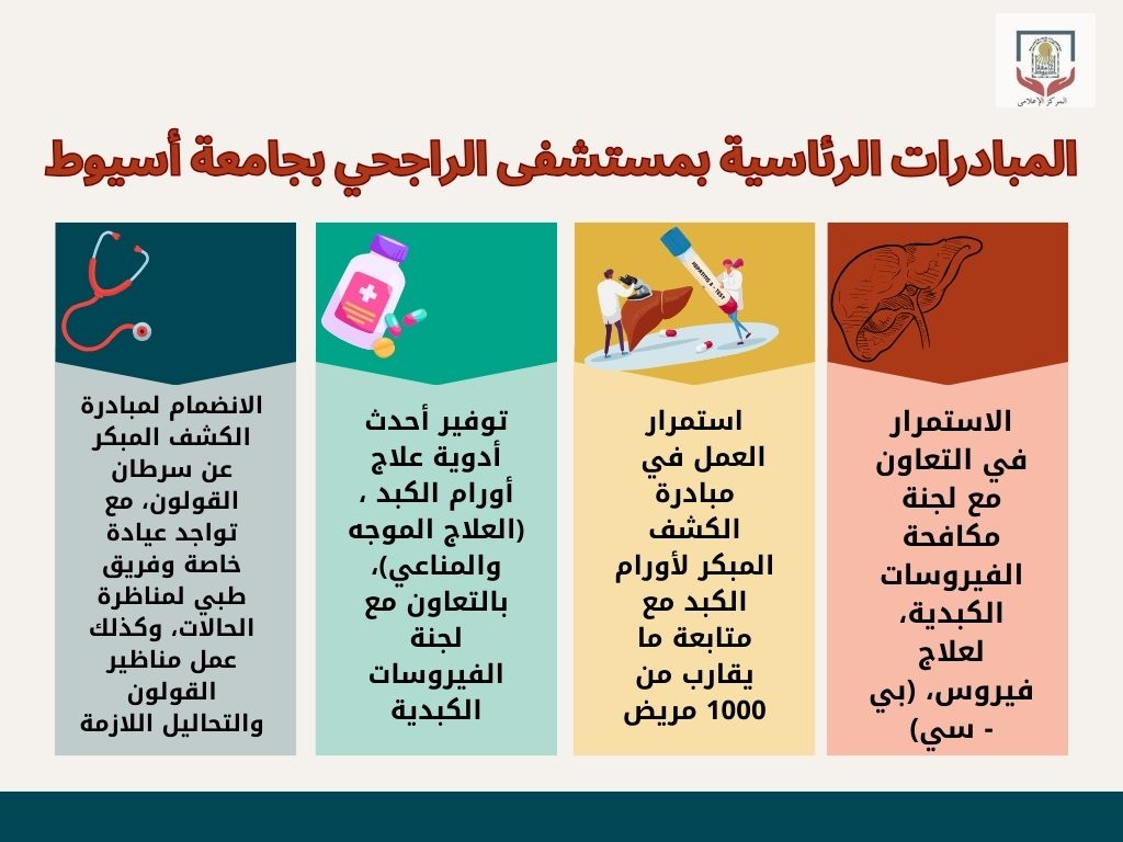 جدير بالذكر، إن مستشفيات جامعة أسيوط شهدت خلال السنوات الأخيرة عمليات تطوير وتحديث شاملة على كافة المستويات وفق أحدث النُظم بهدف تقديم خدمة طبية متميزة على أعلى مستوى وبالمجان للمرضى، وتمثلت أهم انجازات مستشفى الراجحي للكبد الجامعي في الانفوجراف التالي: