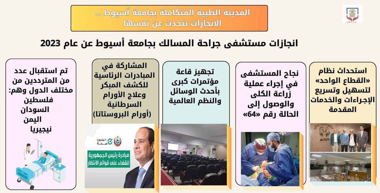 جدير بالذكر، إن مستشفيات جامعة أسيوط شهدت خلال السنوات الأخيرة عمليات تطوير وتحديث شاملة على كافة المستويات وفق أحدث النُظم بهدف تقديم خدمة طبية متميزة على أعلى مستوى وبالمجان للمرضى، وتمثلت أهم انجازات مستشفى جراحة المسالك الجامعي في الانفوجراف التالي:
