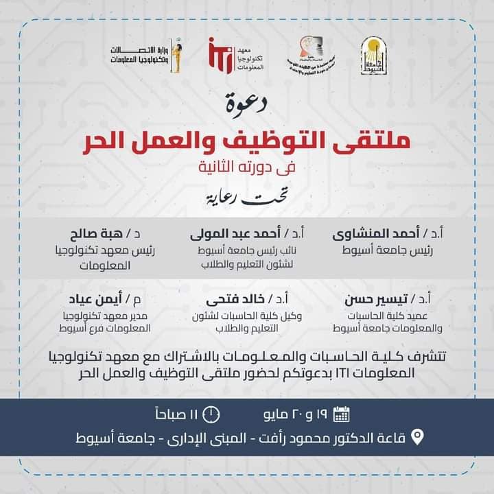 تحت رعاية الدكتور أحمد المنشاوي رئيس جامعة أسيوط؛ تنظم كلية الحاسبات والمعلومات بجامعة أسيوط، بالتعاون مع فرع معهد تكنولوجيا المعلومات بأسيوط؛ فعاليات "ملتقى التوظيف، والعمل الحر "؛ في دورته الثانية بجامعة أسيوط ، يومي ١٩ و ٢٠ من مايو الجاري.