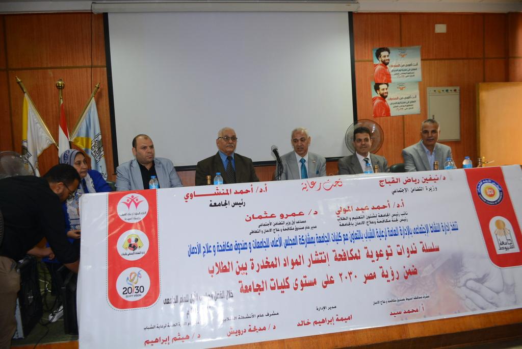 تحت رعاية الدكتور أحمد المنشاوي رئيس جامعة أسيوط؛ نظمت إدارة النشاط الاجتماعي، والرحلات، بالإدارة العامة لرعاية الشباب، اليوم الثلاثاء 14 من نوفمبر؛ ندوة تثقيفية، وتوعوية حول :"مكافحة انتشار المخدرات بين الطلاب"؛ لطلاب كلية الهندسة، وذلك بالتعاون مع وزارة التضامن الاجتماعي بمحافظة أسيوط، وبرئاسة الدكتورة نيفين القباج وزيرة التضامن الاجتماعي.