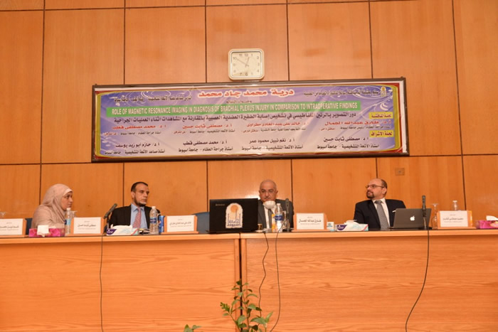 جاء ذلك خلال مشاركته ضمن لجنة المناقشة لرسالة الدكتوراه المقدمة من الطبيبة درية محمد جاد محمد المدرس المساعد بقسم الأشعة التشخيصية بكلية الطب بالجامعة بعنوان " دور التصوير بالرنين المغناطيسي فى تشخيص إصابة الضفيرة العضدية العصبية بالمقارنة مع المشاهدات أثناء العمليات الجراحية " ، كما ضمت لجنة المناقشة كذلك كلاً من الدكتور محمد مصطفى قطب أستاذ جراحة العظام بأسيوط ، والدكتور خالد على عبد الهادي مطراوى أستاذ الأشعة بمعهد البحوث الطبية بجامعة الإسكندرية ، والدكتور مصطفى ثابت حسين أستاذ الأشعة التشخيصية بجامعة أسيوط.