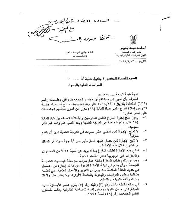 وافق مجلس الجامعة بجلسته المنعقدة بتاريخ 21/1/2014 على وضع ضوابط لمح أعضاء هيئة التدريس أجازة تفرغ علمى طبقا للمادة (88) مكرر من قانون تنظيم الجامعات على النحو التالى :