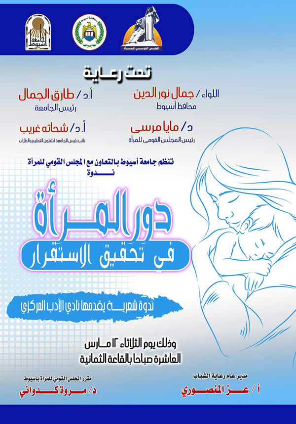 أعلن الدكتور شحاته غريب شلقامى نائب رئيس الجامعة لشئون التعليم والطلاب عن عقد ندوة شعرية مقدمة من نادي الأدب المركزي غداً الثلاثاء 12 مارس بالمبنى الإداري بعنوان " دور المرآة في تحقيق الاستقرار " والتي تنظمها الجامعة بالتعاون مع المجلس القومي للمرأة تحت رعاية اللواء جمال نور الدين محافظ أسيوط ، والدكتور طارق الجمال رئيس الجامعة والدكتورة مايا مرسى رئيس المجلس القومي للمرأة .