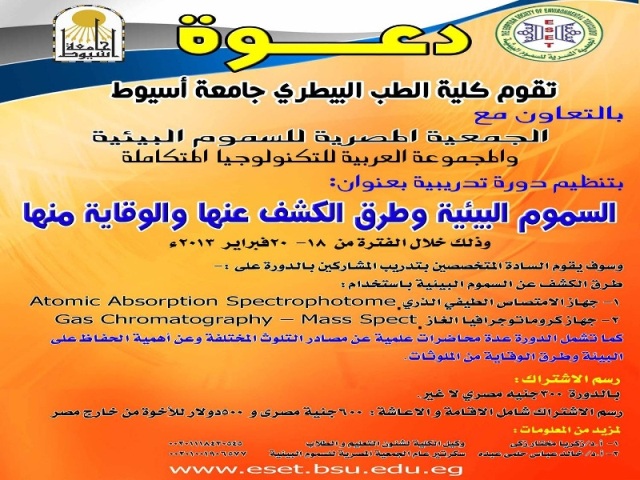 سوف تقوم كلية الطب البيطري جامعة أسيوط بالتعاون مع الجمعية المصرية للسموم البيئية والمجموعة العربية للتكنولوجيا المتكاملة بتنظيم دورة تدريبية بعنوان