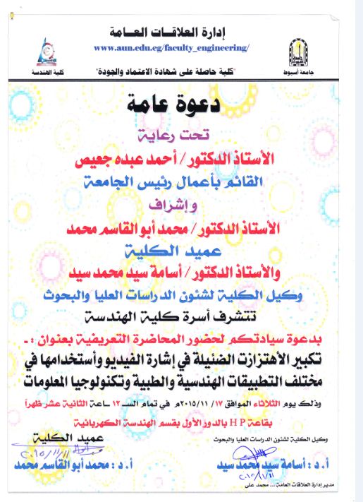 دعوة عامة لحضور المحاضرة التعريفية بعنوان (تكبير الأهتزازات الضئيلة فى إشارة الفيديو) 11 نوفمبر 2015 دعوة عامة لحضور المحاضرة التعريفية بعنوان (تكبير الأهتزازات الضئيلة فى إشارة الفيديو)