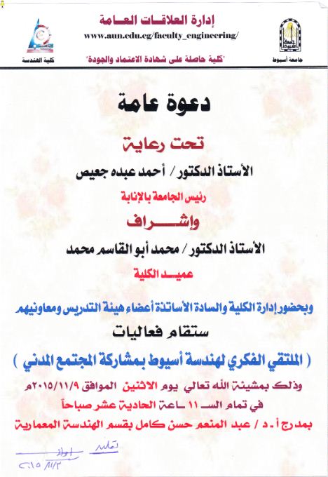 دعوة عامة لحضور الملتقى الفكرى لهندسة أسيوط بمشاركة المجتمع المدنى 3 نوفمبر 2015 دعوة عامة لحضور الملتقى الفكرى لهندسة أسيوط بمشاركة المجتمع المدنى