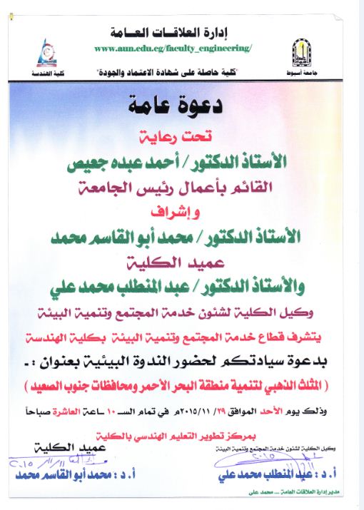 دعوة عامة لحضور الندوة البيئية بعنوان ( المثلث الذهبى لتنمية منطقة البحر الأحمر ومحافظات جنوب الصعيد) 11 نوفمبر 2015 دعوة عامة لحضور الندوة البيئية بعنوان ( المثلث الذهبى لتنمية منطقة البحر الأحمر ومحافظات جنوب الصعيد)