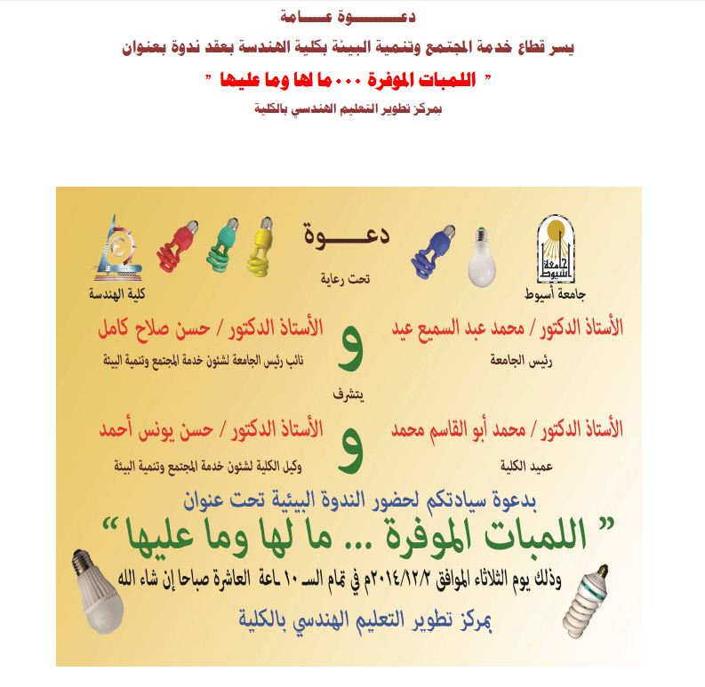 دعوة عامة لحضور ندوة اللمبات الموفرة تحت عنوان" اللمبات الموفرة ما لها وما عليها" 30 نوفمبر 2014 اللمبات الموفرة ما لها وما عليها وذلك يوم الثلاثاء الموافق 2/12/2014 فى تمام الساعة العاشرة صباحاً إن شاء الله بمركز تطوير التعليم الهندسى بالكلية