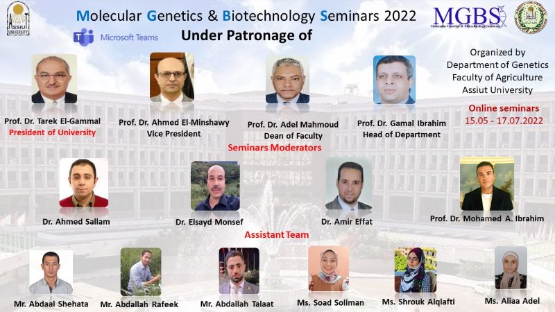يتشرف قسم الوراثة بتنظيم مجموعة من السيمنارات الدولية MGBS 2022 عن بعض البحوث في مجال الوراثة و البيوتكنولوجى في جميع المجالات و التى نشرت فى مجالات دورية ذات معامل تاثير عالى و يحاضر فيها نخبة من اعضاء هيئة التدريس من داخل و خارج الجامعات المصرية. سوف تبد السيمنارات الأسبوعية يوم 15/07/2022 و تنتهى يوم 17/07/2022 . لحضور المناقشات العلمية ، الرجاء الاشتراك في القائمة البريد مع العلم ان الحضور مجانا من خلال برنامج Microsoft team