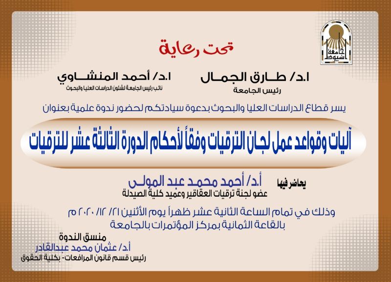 دعوة لحضور ندوة بعنوان آليات وقواعد عمل لجان الترقيات وفقا لاحكام الدورة 13 للنرقيات 17 ديسمبر 2020 الدعوة