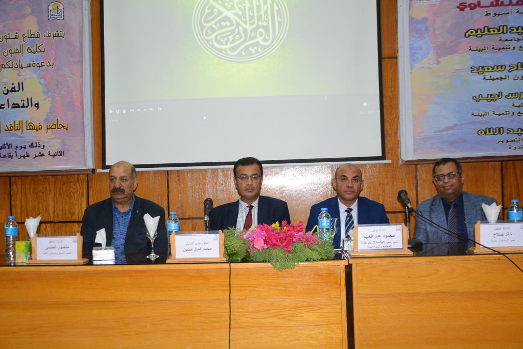 تحت رعاية الدكتور أحمد المنشاوي رئيس جامعة أسيوط، نظمت كلية الفنون الجميلة، اليوم الإثنين ١٣ نوفمبر، معرضاً للفنون التشكيلية لأعضاء هيئة التدريس، وندوة تثقيفية عن "الفن التشكيلي والتداعيات المجتمعية"، وذلك علي هامش الزيارة التثقيفية والفنية، التي نظمها قطاع خدمة المجتمع وتنمية البيئة بكلية الفنون الجميلة؛ للفنان والناقد الكبير الأستاذ محمد كمال حسين، والممتدة فعالياتها في الفترة من ١٢ إلي ١٤ نوفمبر الجاري.
