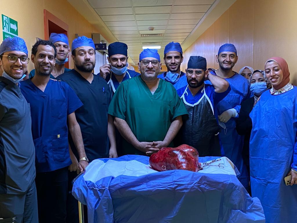 واستقبل معهد جنوب مصر للأورام المريضة، وهي تعاني من آلام شديدة، وانتفاخ شديد بالبطن، وبإجراء الفحوصات الطبية تم اكتشاف ورم ضخم بالرحم والمبيضين يزن (30 )كيلو جراما؛ ملتصق بالإثني عشر، وتم استئصاله مع استئصال الرحم والمبيضين، ومع المحافظة على الأوعية الدموية المهمة بالبطن والحوض والحالبين، وذلك في وقتٍ قياسي؛ حفاظاً على صحة المريضة، التي بدأت في التعافي، وتتم متابعة حالتها بقسم جراحة الأورام بالمعهد.
