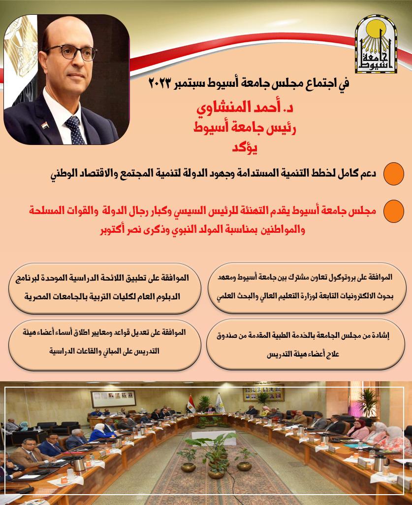 - مجلس جامعة أسيوط يقدم التهنئة للرئيس السيسي وكبار رجال الدولة والقوات المسلحة والمواطنين بمناسبة المولد النبوي وذكرى نصر أكتوبر