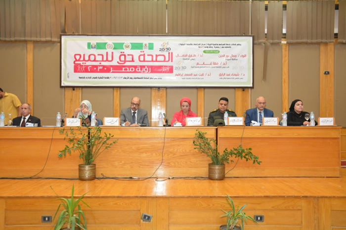 جاء ذلك تعقيباً على انطلاق أعمال ندوة تثقيفية تحت عنوان " الصحة حق للجميع فى رؤية مصر 2030 " والتى ينظمها قطاع البيئة بمركز الدراسات والبحوث البيئية بالتعاون مع جمعية وطن واحد ضمن سلسلة الندوات الثقافية للقطاع ، وذلك تحت رعاية اللواء جمال نور الدين محافظ أسيوط ، وبحضور الدكتورة مها غانم نائب رئيس الكلية لشئون خدمة المجتمع وتنمية البيئة ، العميد أركان حرب بهاء عبد الناصر نيابة عن قيادة المنطقة العسكرية الجنوبية ، والدكتور ثابت عبد المنعم مدير مركز الدراسات والبحوث البيئية ومقرر الندوة ، والدكتور محمد زين وكيل وزارة الصحة بأسيوط ، والدكتور سامى شريف مدير عام التأمين الصحى فرع وسط الصعيد ، والدكتورة فاطمة الخياط وكيل وزارة التضامن الاجتماعي بأسيوط ، والدكتورة شيماء عبد الرازق رئيس مجلس إدارة جمعية وطن واحد ، هذا إلى جانب كوكبة من العمداء و والوكلاء وأعضاء هيئة التدريس من مختلف كليات الجامعة وشباب الأطباء من مديريات الصحة والتأمين الصحى والمهتمين بالمجال الصحى .