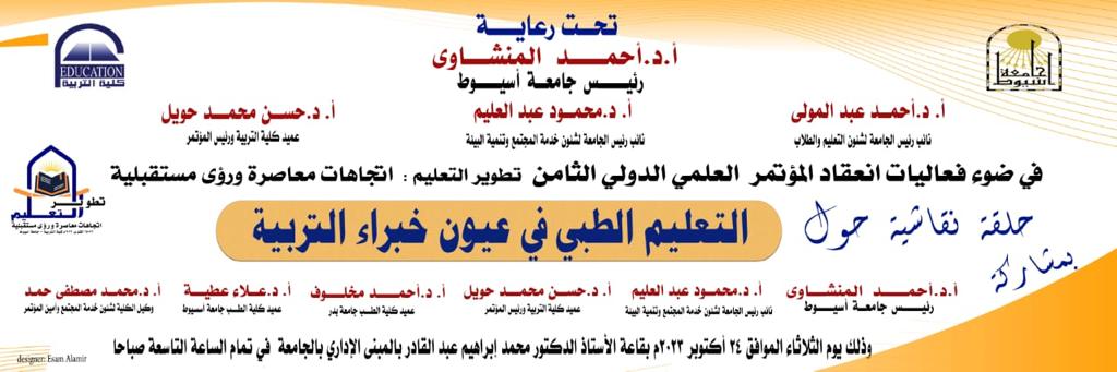 تشهد، غدًا، جامعة أسيوط، انعقاد حلقة نقاشية عن "التعليم الطبي فى عيون خبراء التربية" وذلك ضمن فعاليات اليوم الثانى من المؤتمر الدولي الثامن لكلية التربية، والمنعقد تحت عنوان " تطوير التعليم: اتجاهات معاصرة ورؤى مستقبلية"، تحت رعاية الدكتور أحمد المنشاوي رئيس الجامعة، والدكتور أحمد عبد المولى نائب رئيس الجامعة لشئون التعليم والطلاب، والدكتور محمود عبد العليم نائب رئيس الجامعة لشئون خدمة المجتمع وتنمية البيئة، وتحت إشراف الدكتور حسن محمد حويل عميد كلية التربية ورئيس المؤتمر، والدكتور محمد رياض أحمد وكيل الكلية لشئون الدراسات العليا والبحوث ومقرر المؤتمر ، والدكتور محمد جابر قاسم وكيل الكلية لشئون التعليم والطلاب ونائب رئيس المؤتمر، والدكتور محمد مصطفى حمد وكيل الكلية لشئون خدمة المجتمع وتنمية البيئة وأمين المؤتمر، وبمشاركة السادة أعضاء لجنة قطاع الدراسات التربوية بالمجلس الأعلى للجامعات، وأستاذة وخبراء التربية والتعليم فى مصر ، وعدد من الدول العربية المشاركة.