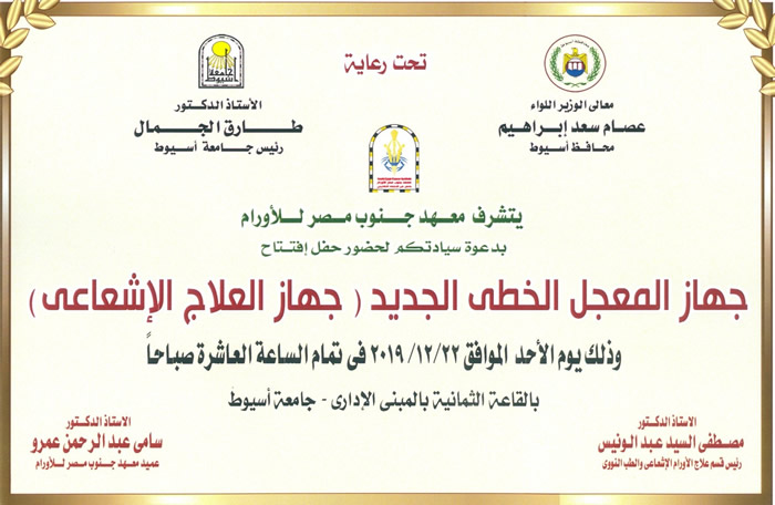 أعلن الدكتور طارق الجمال رئيس جامعة أسيوط عن انطلاق فعاليات الاحتفال بافتتاح جهاز المعجل الخطى الجديد (جهاز العلاج الإشعاعي) والذي يعد أحدث أجهزة العلاج الإشعاعي على مستوى العالم ، وذلك غداً الأحد الموافق 22 من ديسمبر الجاري في الـعاشرة صباحاً بالقاعة الثمانية بالمبنى الإداري ، والذي من المقرر أن يشهد حفل الافتتاح حضور اللواء عصام سعد إبراهيم محافظ أسيوط .
