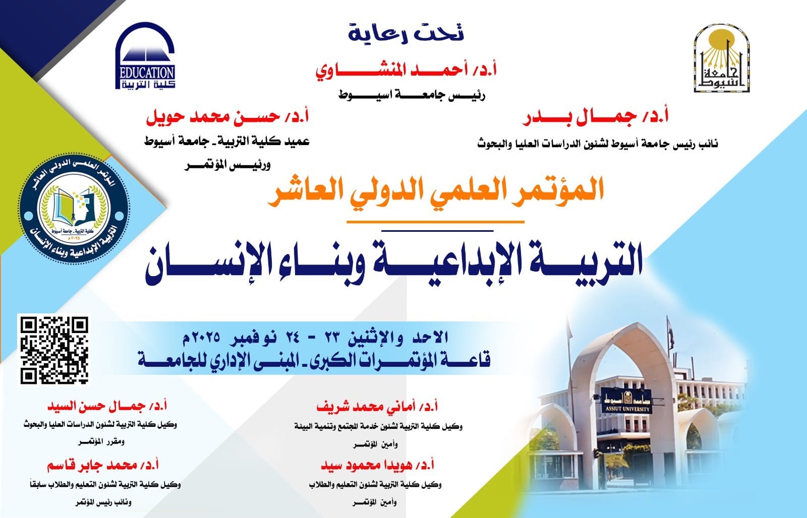 تنطلق غدًا فعاليات المؤتمر العلمي الدولي العاشر بكلية التربية – جامعة أسيوط تحت عنوان "التربية الإبداعية وبناء الإنسان"، والذي يُعقد تحت رعاية الدكتور أحمد المنشاوي رئيس جامعة أسيوط، وبمشاركة نخبة من القيادات الأكاديمية والخبراء في مجالات التربية.