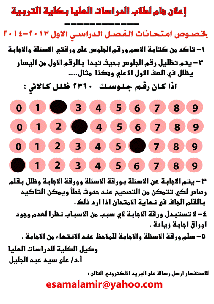 هام وعاجل لطلاب الدراسات العليا بكلية التربية بخصوص امتحانات الفصل الدراسى الاول 2013-2014 16 يناير 2014 هام وعاجل لطلاب الدراسات العليا بكلية التربية بخصوص امتحانات الفصل الدراسى الاول 2013-2014