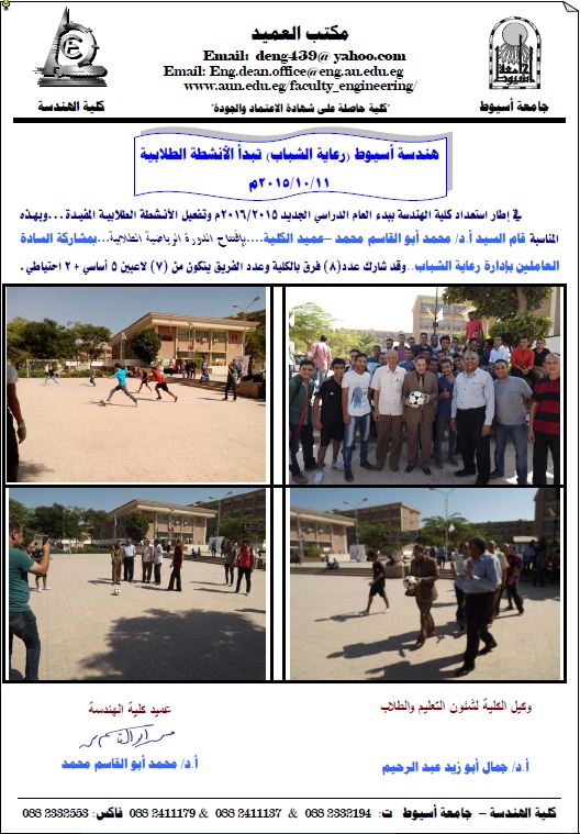 هندسة أسيوط (رعاية الشباب) تبدأ الأنشطة الطلابية 12 أكتوبر 2015 هندسة أسيوط (رعاية الشباب) تبدأ الأنشطة الطلابية