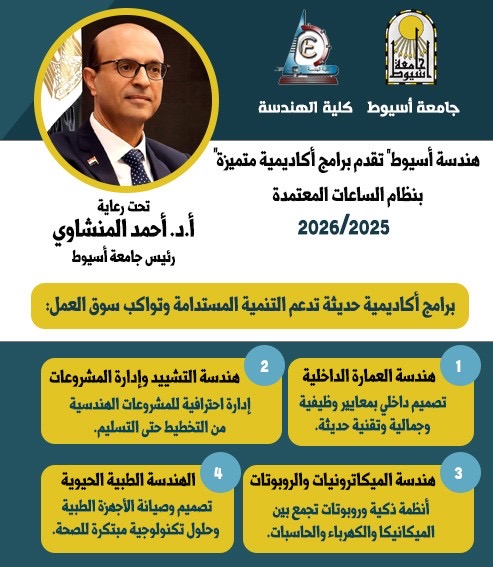 "هندسة أسيوط" تقدم برامج أكاديمية متميزة بنظام الساعات المعتمدة للعام الجامعي 2025-2026 لدعم التنمية المستدامة وتلبية متطلبات سوق العمل