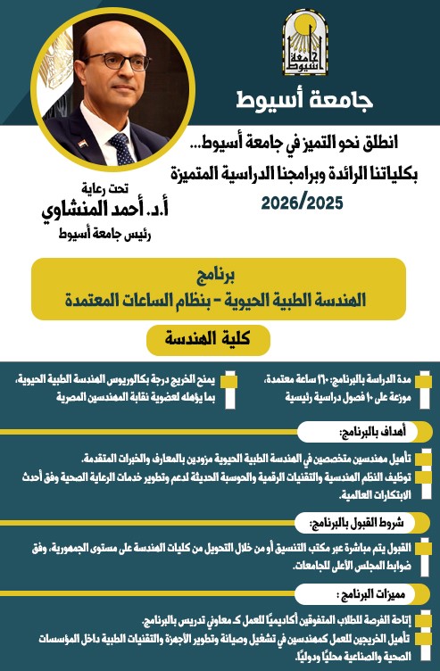 أعلنت كلية الهندسة بجامعة أسيوط عن إطلاق برنامج "الهندسة الطبية الحيوية" بنظام الساعات المعتمدة، وذلك اعتبارًا من العام الجامعي الجديد 2025/2026، في خطوة تعكس حرص الجامعة على تطوير منظومتها التعليمية وتقديم برامج أكاديمية حديثة تواكب التطورات التكنولوجية العالمية.