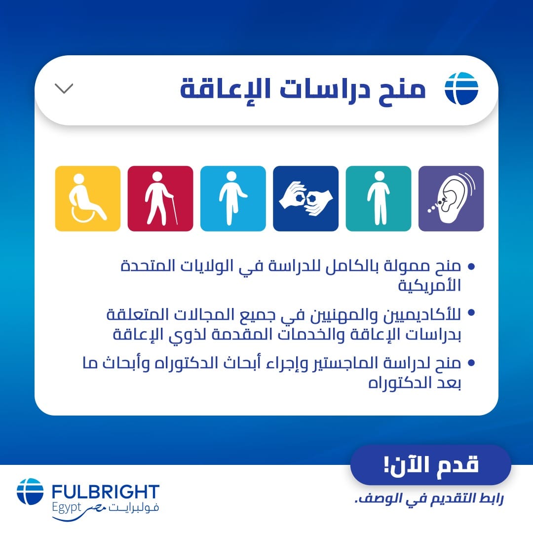 وذلك في اطار مبادرة هيئة فولبرايت للدمج والاتجاه، تقدم الهيئة منح للمهنيين والأكاديميين في مجالات دراسات وخدمات الإعاقة؛ لإتاحة الفرص للدراسة واجراء الأبحاث في الولايات المتحده في مختلف المجالات العلميه والأدبية علي المستويات الاتيه: