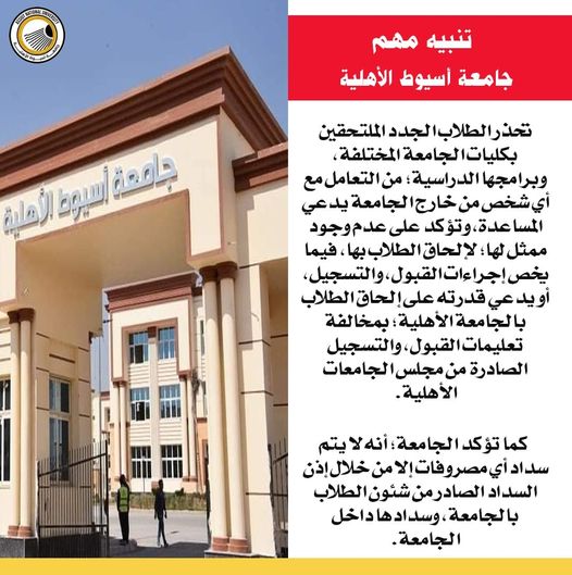 تحذر جامعة أسيوط الأهلية؛ من الأشخاص الذين يدعون صلتهم بالجامعة، ويدعون أنهم ينهون إجراءات القبول، والتسجيل؛ بالمخالفة لتعليمات القبول، والتسجيل، مشددة على أن الجامعة ستتخذ كافة الإجراءات القانونية ضدهم، ومقاضاتهم؛ لاستغلال اسم الجامعة؛ مما يسبب ضرراً بالغاً للطلاب.