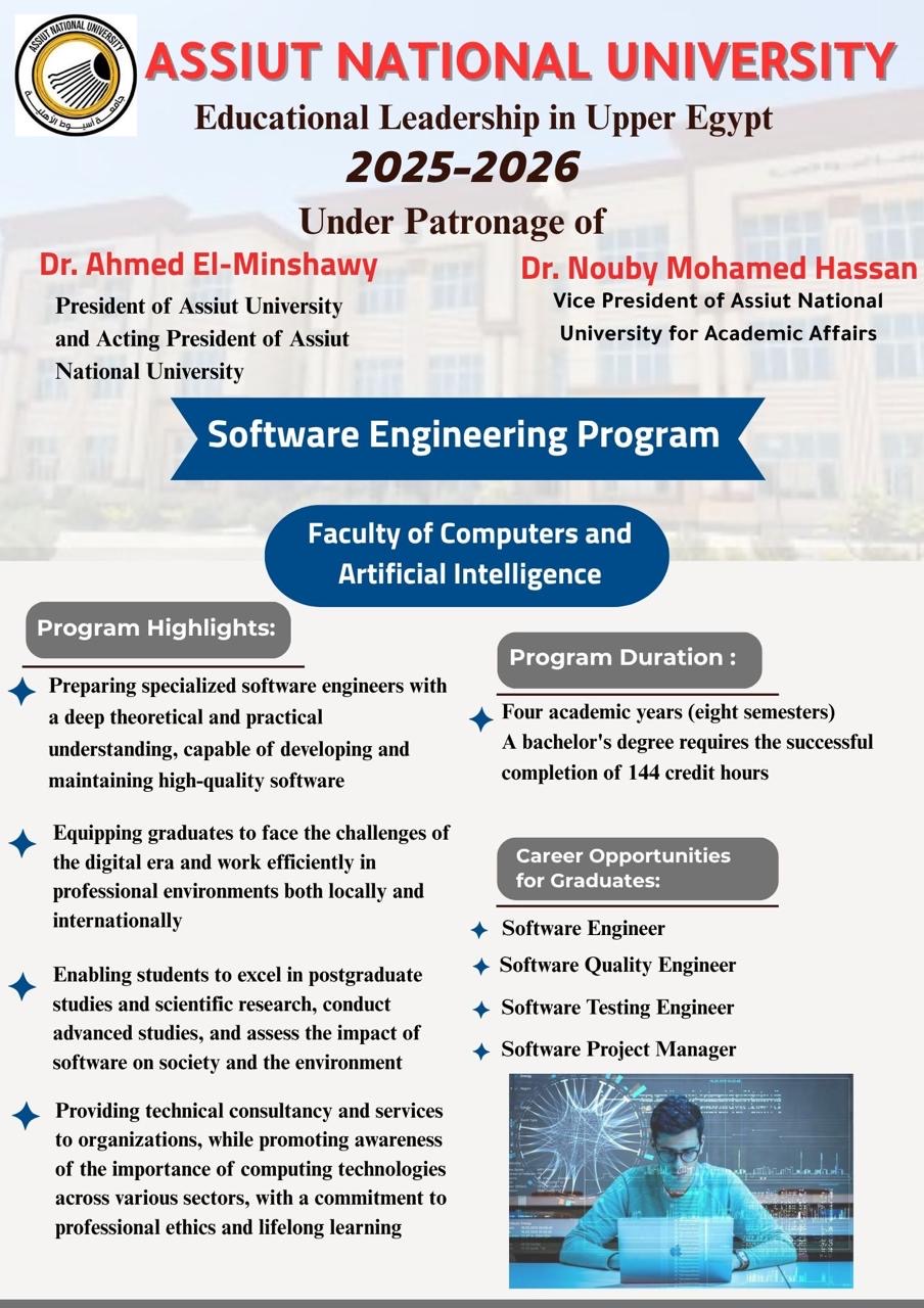 وأشار الدكتور نوبي محمد حسن، إلى أن البرنامج يهدف إلى إعداد مهندسين محترفين يتمتعون بفهم نظري وعملي متكامل في مجال هندسة البرمجيات، مع القدرة على تطوير وصيانة البرمجيات بجودة عالية، ومواجهة تحديات العصر الرقمي، والعمل بكفاءة في بيئات احترافية مع الالتزام بأخلاقيات المهنة والتعلم المستمر.