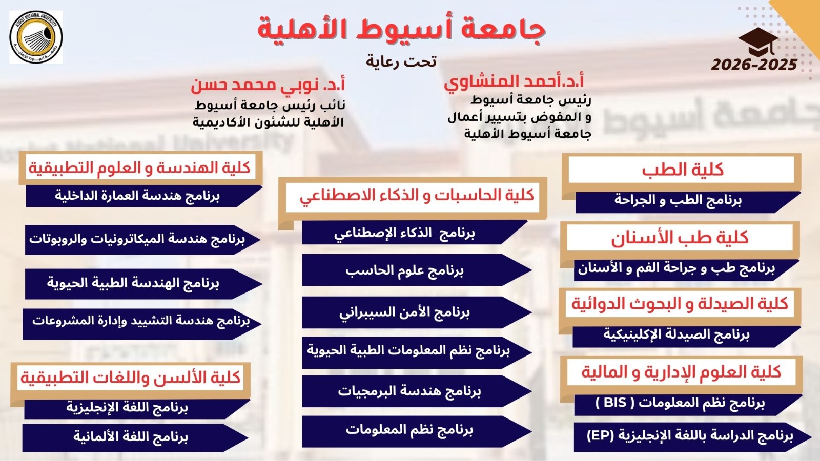 تواصل جامعة أسيوط الأهلية استعداداتها المكثفة لانطلاق العام الجامعي 2025/2026، من خلال طرح مجموعة متميزة من البرامج الأكاديمية الحديثة، التي تعمل بنظام الساعات المعتمدة، وتستهدف طلاب التنسيق في مختلف المجالات الطبية والهندسية والتكنولوجية والتجارية واللغوية، بما يعكس التزام الجامعة بتوفير تعليم جامعي متطور وفقًا لأحدث معايير الجودة العالمية.