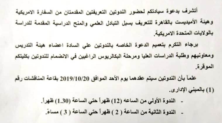 في إطار ما تشهده الجامعة من حراك علمي وبحثي علي مستوى عال من الكفاءة والتميز في مختلف المجالات العلمية , فقد أعلن الدكتور طارق الجمال رئيس جامعة أسيوط عن تنظيم الجامعة الأحد القادم لندوتين مقدمتين من السفارة الأمريكية وهيئة الأميديست بالقاهرة للتعريف بسبل التبادل العلمي والمنح الدراسية المقدمة للدراسة بالولايات المتحدة الأمريكية , وهو ما يأتي متوافقاً مع استراتيجية الجامعة في الحرص علي تطوير منظومة التعليم الجامعي والارتقاء بالمستوي والأكاديمي وتبادل الخبرات البحثية علي نحو واسع .