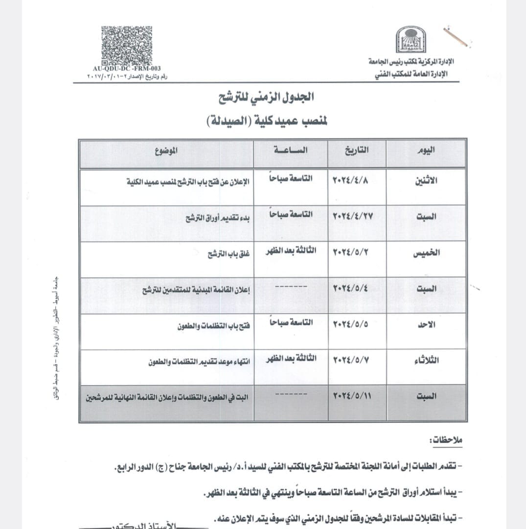 وتقدم الطلبات إلى أمانة اللجنة المختصة للترشح بالمكتب الفنى لرئيس الجامعة جناح (ج) الدور الرابع بالمبنى الإداري، مع اتباع باقى الإجراءات القانونية المنصوص عليها فى هذا الشأن وفق الجدول الزمنى المعلن.