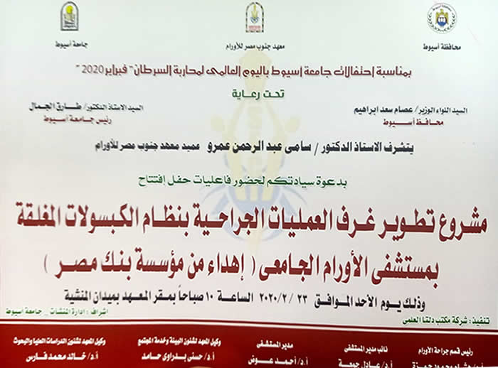 أعلن الدكتور طارق الجمال رئيس جامعة أسيوط عن افتتاح مشروع تطوير غرف العمليات الجراحية بنظام الكبسولات المغلقة بمستشفى الأورام الجامعى غداّ الاحد 23 من فبراير الجارى فى تمام العاشرة صباحا بمقر معهد جنوب مصر للأورام ، وهو ما يأتى هذا فى إطار حرص الجامعة على تطوير ورفع كفاءة خدماتها الطبية المقدمة لمختلف المرضى المترددين على عياداتها ومستشفياتها الجامعية فى مختلف التخصصات والأقسام ، فى ظل عمل وجهد بلا كلل ولا ملل من جانب أعضائها من الكوادر الطبية المدربة على أعلى مستوى لتقديم خدمة علاجية وصحية تحقق نسب شفاء مرتفعة للمرضى وتصل لمقاييس عالمية .