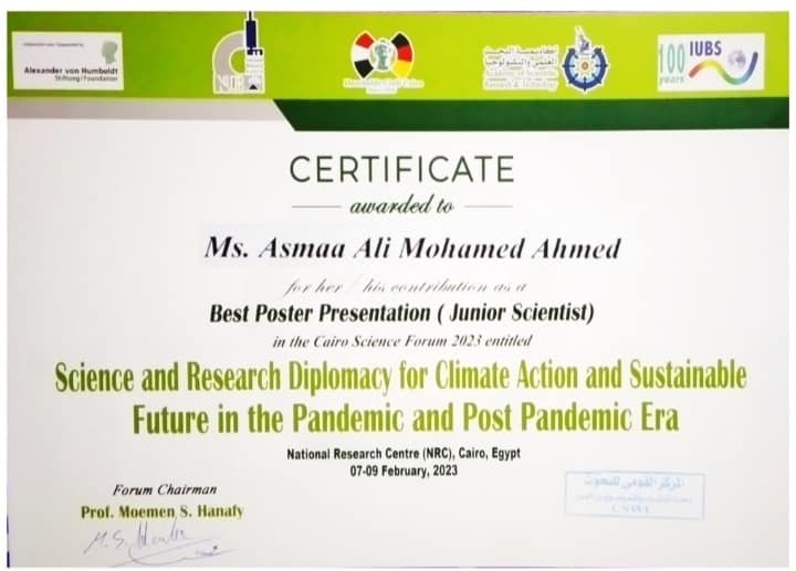 ومشيراً أن الباحثة قد ناقشت رسالة الماجستير بعنوان "التحليل الوراثي الجزيئي لتحمل الجفاف في طور البادره في القمح"، حيث تناولت الرسالة تقييم 198 تركيب وراثي من القمح في طور البادره تحت إجهاد جفاف شديد وتم انتخاب عدد من التراكيب الوراثية المتحملة للجفاف كما شملت الدراسة على اكتشاف حوالي 27 جين متحكم في الجفاف والتي يمكن استخدامهم في برامج التربية لتحسين الجفاف في القمح وإنتاج سلالات أكثر مقاومة وتمت المناقشة تحت إشراف الدكتور محمد يونس الأستاذ المتفرغ بقسم الوراثة ، والدكتور أحمد عاطف الأستاذ المساعد بقسم الوراثة، والدكتور السيد عبد المنصف الأستاذ المساعد بقسم الوراثة، وتم نشر ثلاث بحوث من الرسالة في مجلات دولية، وأيضاً تم تمويل الرسالة من هيئة العلوم للتكنولوجيا والاإبتكار STDF تحت رقم 39444 .
