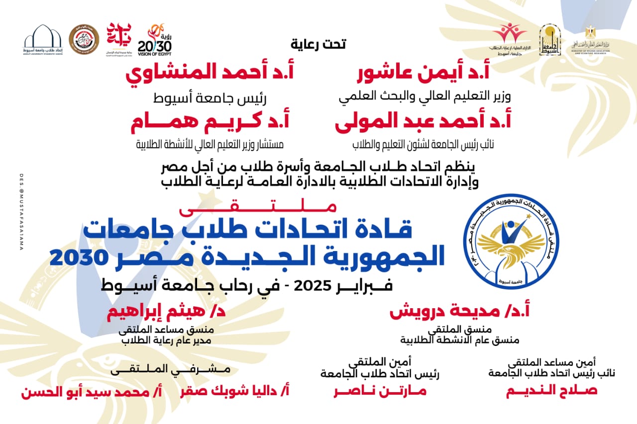 تشهد جامعة أسيوط؛ انطلاق فعاليات ملتقى "قادة اتحادات طلاب جامعات الجمهورية الجديدة.. مصر 2030"، يوم الإثنين الموافق 10 من فبراير، وذلك تحت رعاية الدكتور أيمن عاشور وزير التعليم العالي والبحث العلمي، والدكتور أحمد المنشاوي رئيس جامعة أسيوط، بقاعة الأستاذ الدكتور محمد رأفت بالمبنى الإداري بالجامعة، بمشاركة قادة الاتحادات الطلابية من مختلف الجامعات، والمعاهد المصرية.