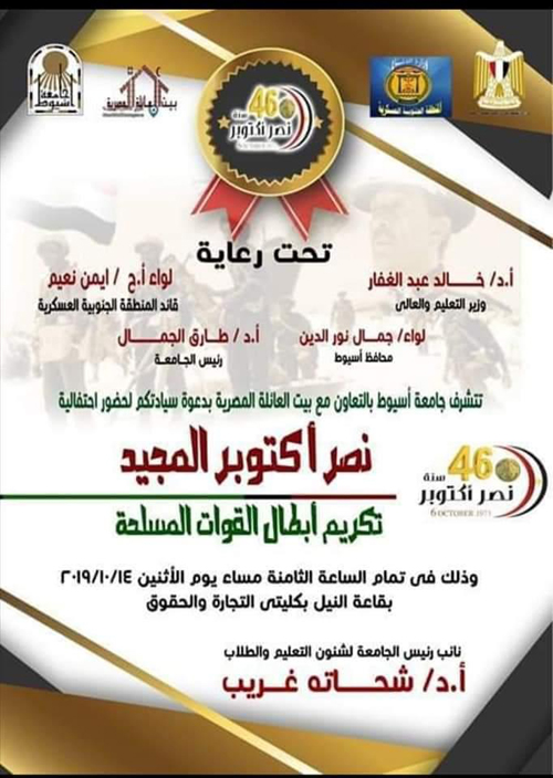 أعلن الدكتور طارق الجمال رئيس جامعة أسيوط عن إقامة الجامعة مساء اليوم الاثنين 14 أكتوبر احتفالها بنصر أكتوبر المجيد والذي تنظمه بالتعاون مع بيت العائلة المصرية بأسيوط وذلك بحضور اللواء جمال نور الدين محافظ أسيوط والقيادات التنفيذية والأمنية والشعبية وكذلك قيادات المنطقة الجنوبية العسكرية وكذلك ضيوف جامعة أسيوط من المشاركين في فاعليات " مصر تستطيع بطلابها " ولفيف من عمداء كليات الجامعة وأعضاء هيئة التدريس .