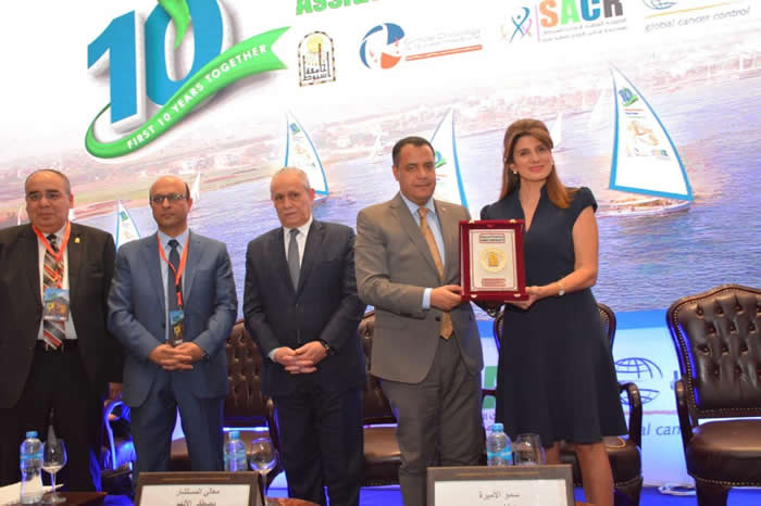 كشف الدكتور سمير شحاتة الأستاذ بقسم علاج الأورام والطب النووي بجامعة أسيوط ورئيس المؤتمر الدولي العاشر لعلاج الأورام والمنعقد فى مدينة الأقصر فى الفترة من 20 الى 22 من فبراير الجاري عن ان وقائع الجلسة الرسمية للمؤتمر تضمنت تكريم جامعة أسيوط لكل من الأميرة دينا مرعد رئيسة الاتحاد الدولي لمكافحة السرطان والمستشار مصطفى الهم محافظ الأقصر وذلك بتقديم كلاً من درع الجامعة ودرع المؤتمر كهدية تذكارية تكريما لهما وهو ما قدمه لهما نيابة عن الدكتور طارق الجمال رئيس الجامعة الدكتور شحاتة غريب شلقامى نائب رئيس الجامعة لشئون التعليم والطلاب والدكتور أحمد المنشاوي نائب رئيس الجامعة لشئون الدراسات العليا والبحوث .