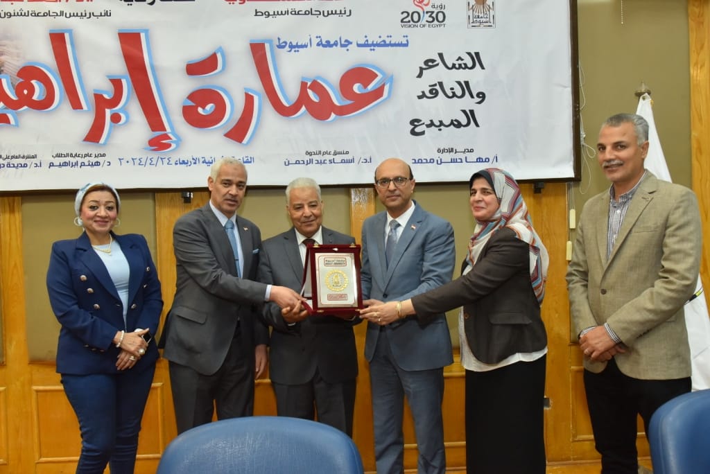 كرمت جامعة أسيوط، تحت رعاية وبحضور الدكتور أحمد المنشاوي رئيس الجامعة؛ اليوم الأربعاء الموافق ٢٤ من أبريل؛ الشاعر والناقد المبدع عمارة إبراهيم؛ بحضور شعراء ومثقفي الصعيد، وأهدى الدكتور أحمد المنشاوي، الشاعر عمارة إبراهيم؛ درع تكريم الجامعة على أعماله الأدبية، ومشواره الفني.